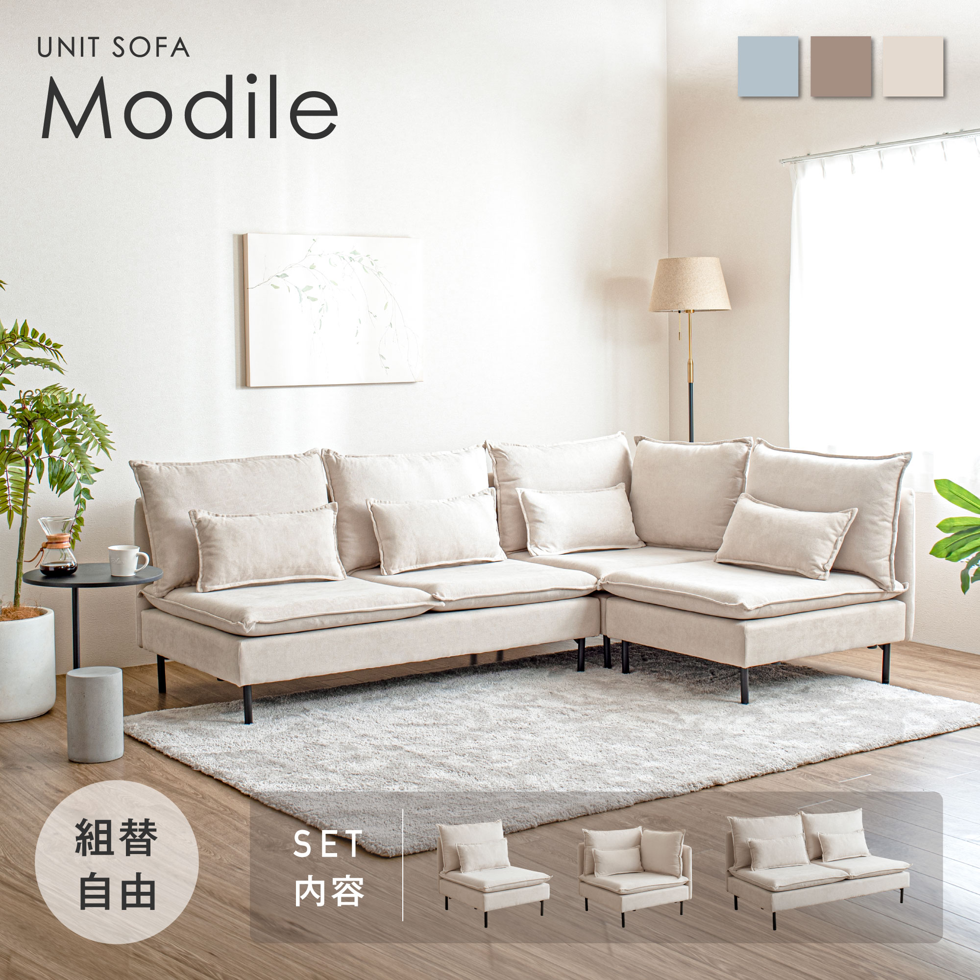 スツールの位置を変えることで左右入れ替えはもちろんコーナーソファとしてだけじゃなく、3人掛け+2人掛け、3人掛け+1人掛け+1人掛けなどいろんなレイアウトが可能。